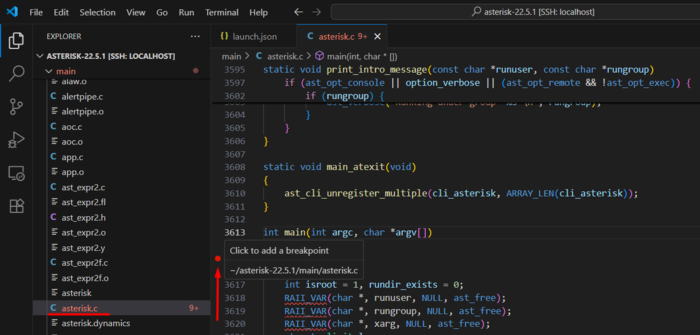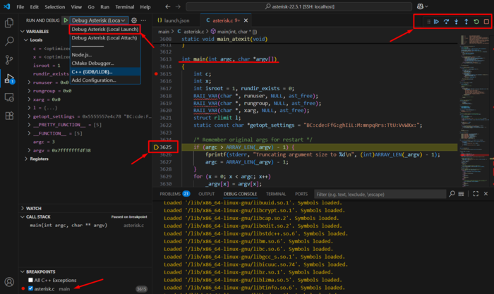 • Протокол: TCP - Порт хоста: 2022 - Порт гостя: 22 При инсталляции ОС установить сервер SSH. Подробнее про установку ОС Linux см. в документации к своему дистрибутиву. Установив ОС на ВМ нужно убедится в доступности машины по SSH: ssh user@localhost -p 2022 В случае успеха настраиваем плагин Remote Explorer. Добавляем подключение по SSH и редактируем файл конфигурации для подключения к ВМ (cм. скриншот): Host localhost HostName 127.0.0.1 User username Port 2022 В окне соединений плагина Remote Explorer на строке соединения нажимаем Connect in current Window. Вводим пароль в окне поиска, когда система его запросит. В случае успеха откроется новое окно VS Code с индикатором подключения в правом нижнем углу (>{SSH: localhost). Если панель с командной строкой не открыта нажимаем Ctrl+J и видим приглашение консоли. Установка Asterisk в отладочном режиме с минимальной конфигурацией. В консоли нужно убедится, что Интернет доступен из ВМ: ping 1.1.1.1 Качаем свежую версию исходного кода Asterisk с сайта компании. wget https://downloads.asterisk.org/pub/telephony/asterisk/asterisk-22-current.tar.gz tar -x -zf asterisk-22-current.tar.gz cd asterisk-22 Устанавливаем зависимости для компиляции системы из исходного кода и отладчик: sudo ./contrib/scripts/install_prereq install sudo apt install gdb Запускаем скрипты конфигурирования проекта в отладочном режиме. Выключаем все модули. ./configure --enable-dev-mode make menuselect.makeopts menuselect/menuselect --disable-all --enable pbx_config menuselect.makedeps Запускаем процесс компиляции с отладочными символами. make sudo make install После компиляции стартуем процесс Asterisk и консоль для проверки корректности запуска echo -e "[modules]\\nautoload = yes" | sudo tee -a /etc/asterisk/modules.conf sudo cp configs/basic-pbx/extensions.conf /etc/asterisk/ asterisk -f После запуска видим предупреждения о том, что не найдены конфигурационные файлы и строчку Asterisk Ready. Можно приступать к отладке. Отладка Asterisk: В окне VS Code, подключённому к ВМ, устанавливаем плагин C/C++ и C/C++ Extension Pack. Открываем VS Code Explorer (Ctrl+Shift+E) и жмем Open Folder. В меню поиска выбираем каталог с Asterisk и нажимаем Ok. Открывается новое окно с деревом исходного кода Asterisk. В меню VS Code выбираем пункт Run - Add Configuration - CMake Debug и в открывшемся файле .vscode/launch.json удаляем все и добавляем 2 новых конфигурации: { "version": "0.2.0", "configurations": [ { "name": "Debug Asterisk (Local Launch)", "type": "cppdbg", "request": "launch", "program": "/usr/sbin/asterisk", "args": ["-f", "-vvvgc"], // Консольный режим с максимальным логгированием "stopAtEntry": false, "cwd": "${workspaceFolder}", "environment": [], "externalConsole": false, "MIMode": "gdb", "miDebuggerPath": "/usr/bin/gdb", "setupCommands": [ { "description": "Enable pretty-printing", "text": "-enable-pretty-printing", "ignoreFailures": true } ] }, { "name": "Debug Asterisk (Local Attach)", "type": "cppdbg", "request": "attach", "program": "/usr/sbin/asterisk", "processId": "${command:pickProcess}", "MIMode": "gdb", "miDebuggerPath": "/usr/bin/gdb", "miDebuggerArgs": "--interpreter=mi", "setupCommands": [ { "description": "Enable pretty-printing", "text": "-enable-pretty-printing", "ignoreFailures": true }, { "description": "Set debug mode", "text": "handle SIG33 pass nostop noprint" } ], } ] } Это конфигурации с локальным запуском и с присоединением к уже запущенному процессу. Сохраняем .vscode/launch.json (Ctrl+s). В окне дерева каталогов Asterisk в VS Code Explorer (Ctrl+Shift+E) открываем файл main/asterisk.c Мотаем на строчку 3613 и видим там функцию int main(int argc, char *argv[]). Устанавливаем точку остановки, нажав на красный кружок левее от номера строки (появится при наведении указателя мыши). Запускаем процесс отладки нажав на клавиатуре F5 или через меню Run - Debug. Процесс должен остановиться на точке входа и далее контролируем исполнение Выполнить строку без захода внутрь функции F10 Выполнить строку с заходом внутрь функции F11 В меню слева выбираем окно Run and Debug (Ctrl+Shift+D), видим локальные переменные, текущие потоки и точки останова. Отладка чтения файла конфигурации PBX extensions.conf: Ра